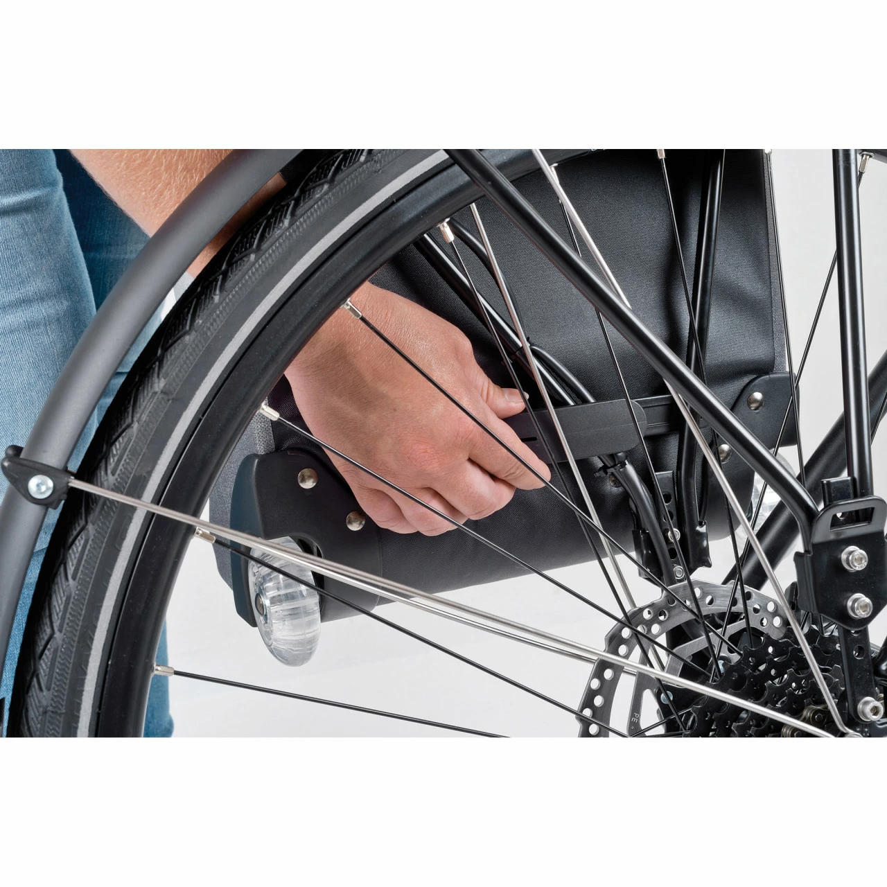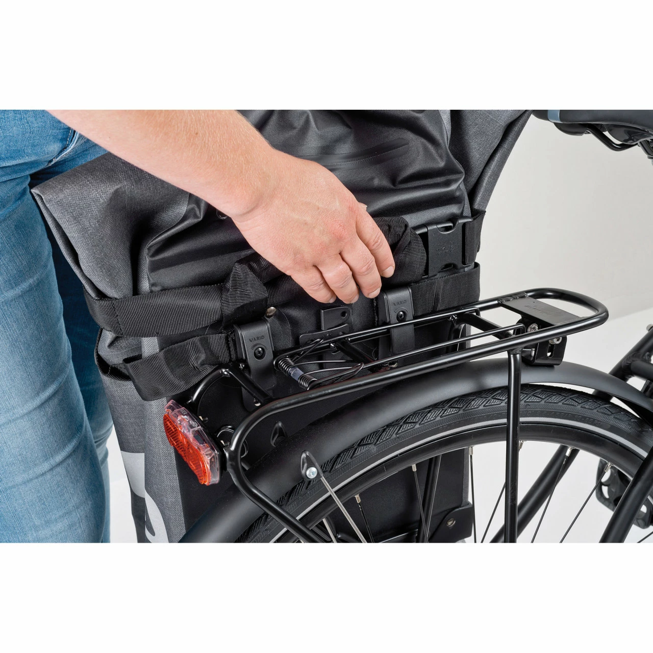Die Fahrradtasche ist dreifach gesichert, damit sie auch auf holprigen Wegen immer zuverlässig am Gepäckträger hält.