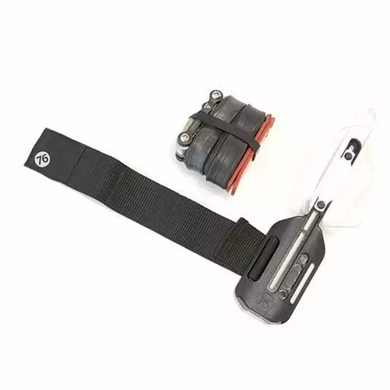 Dieser sicher verstellbare Strap befestigt 29er Schlauch, Hebel, Multitool und CO2-Patronen. Robuste Silikonbänder zur Verbindung der Gegenstände untereinander sind ebenfalls enthalten. Ein durchdachtes Detail: im Boden der Halterung sind Ausbuchtungen für Ersatz-Kettenschlösser eingearbeitet. Das ganze System wiegt nur 72 Gramm inklusive Schrauben und ist damit die vielleicht schlankeste Befestigung überhaupt. Als Zubehör sind außerdem ein wetterfestes Dry Bag und ein Zip Case erhältlich, die perfekt zur Halterung passen.