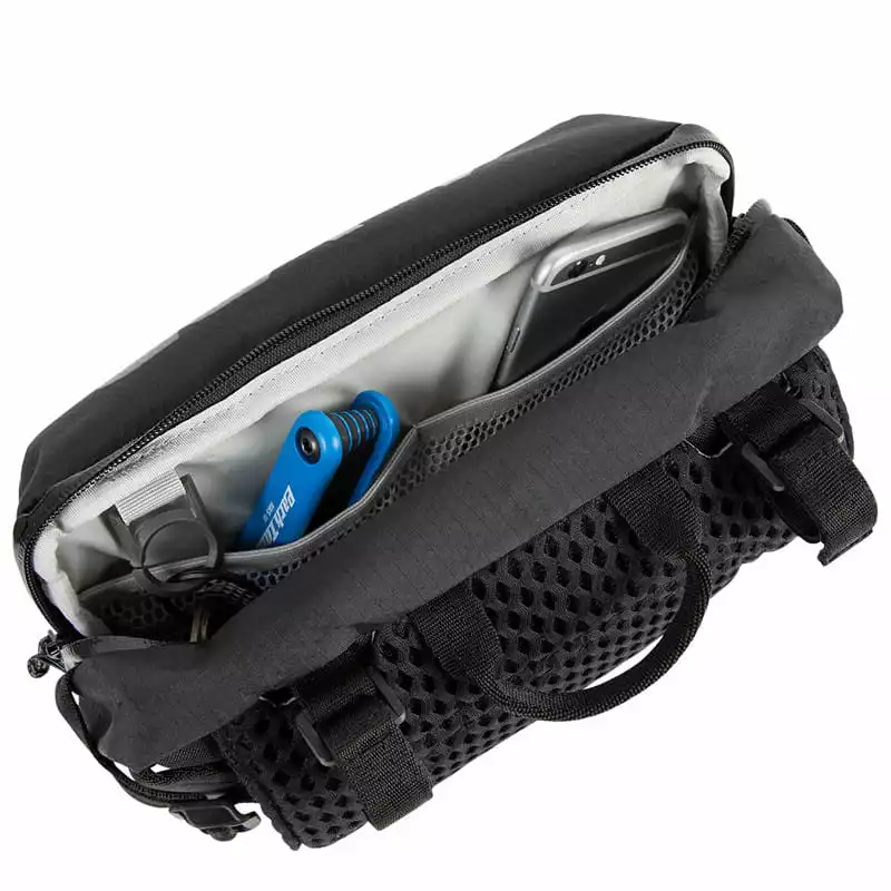 Ein abgedichteter Reißverschluss über die Hälfte der Tasche schützt den Inhalt vor Wasser und Staub. Im Innenraum hast du schnellen Zugriff auf zwei Mesh-Fächer. Ein kleines Innenfach für Wertsachen lässt sich außerdem per Reißverschluss verschließen und ein Schlüsselhalter sorgt dafür dass dein Schlüsselbund an Ort und Stelle bleibt. Mit einer Außenkordel kannst du außerdem sperrige Gegenstände befestigen.
