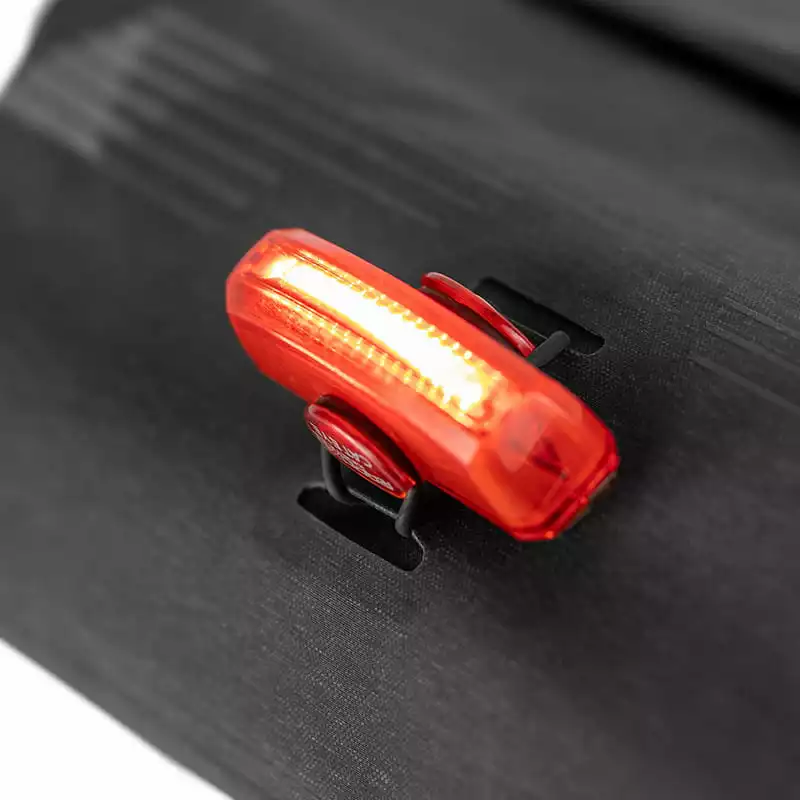 Reflektierende Elemente sorgen für eine verbesserte Sichtbarkeit im Straßenverkehr. Zusätzlich lässt sich an der Unterseite (sehr gut sichtbar, wenn ihr auf dem Rad sitzt) ein Rücklicht befestigen.