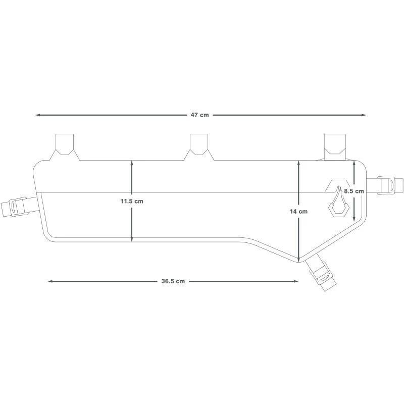 Die Tasche ist auf breitere Rahmendreiecke zugeschnitten und aus leichtem wetterfestem Laminat geschneidert, das auch widerstandsfähig genug für den Off-Road-Gebrauch ist. Die Tasche ist stabil genug, um auch schwerere Dinge aufzunehmen und damit den Schwerpunkt des Rades niedrig zu halten.