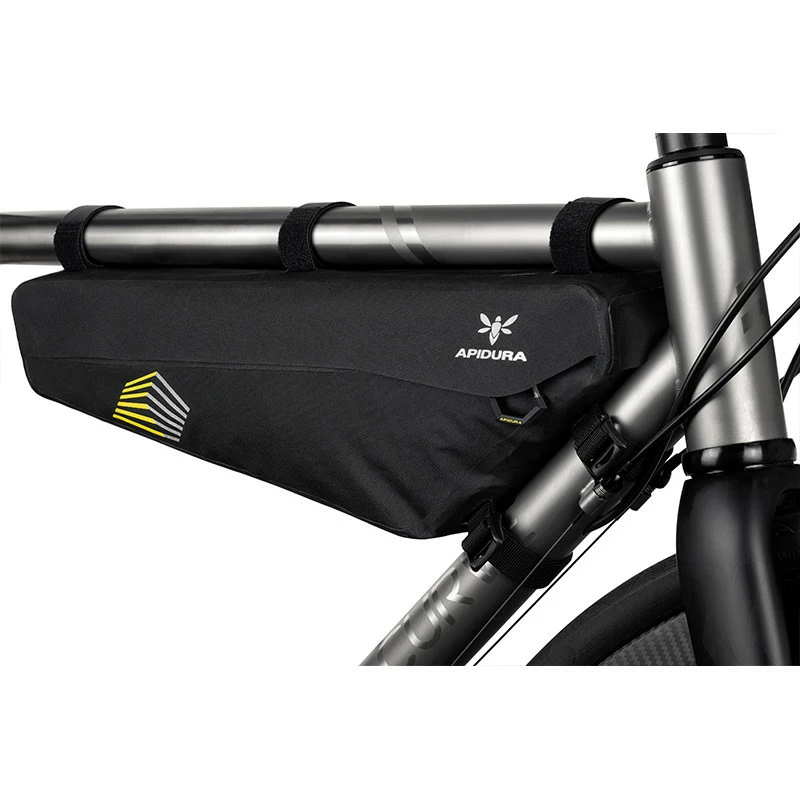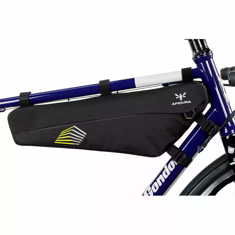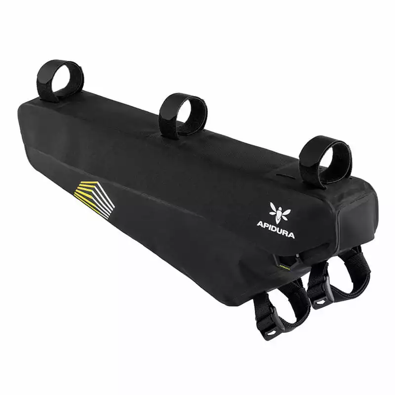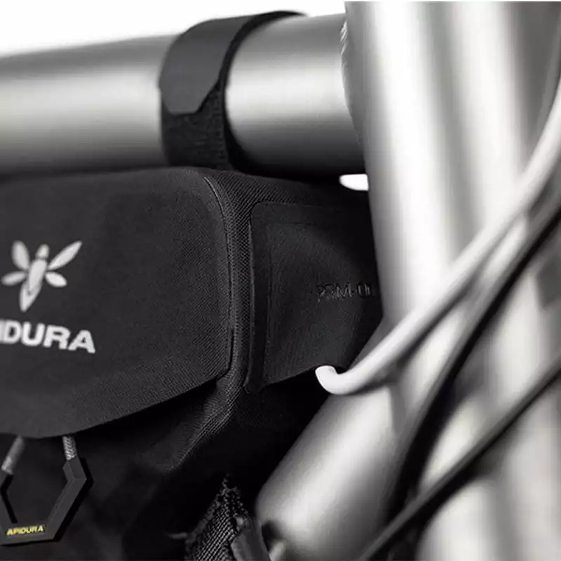 Das Racing Frame Pack besteht aus Hexalon – einem extra für Apidura entwickelten Schicht-Gewebe. Alle Merkmale wurden auf Langdistanzgebrauch und Strapazierfähigkeit hin optimiert.An wichtigen Stellen wird die Tasche mit geschäumtem Material verstärkt. So erreicht man ein kleine und dennoch leichte Tasche. Sehr praktisch ist der geschützte Kabelauslass im Frontbereich.