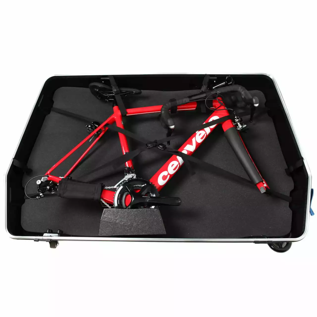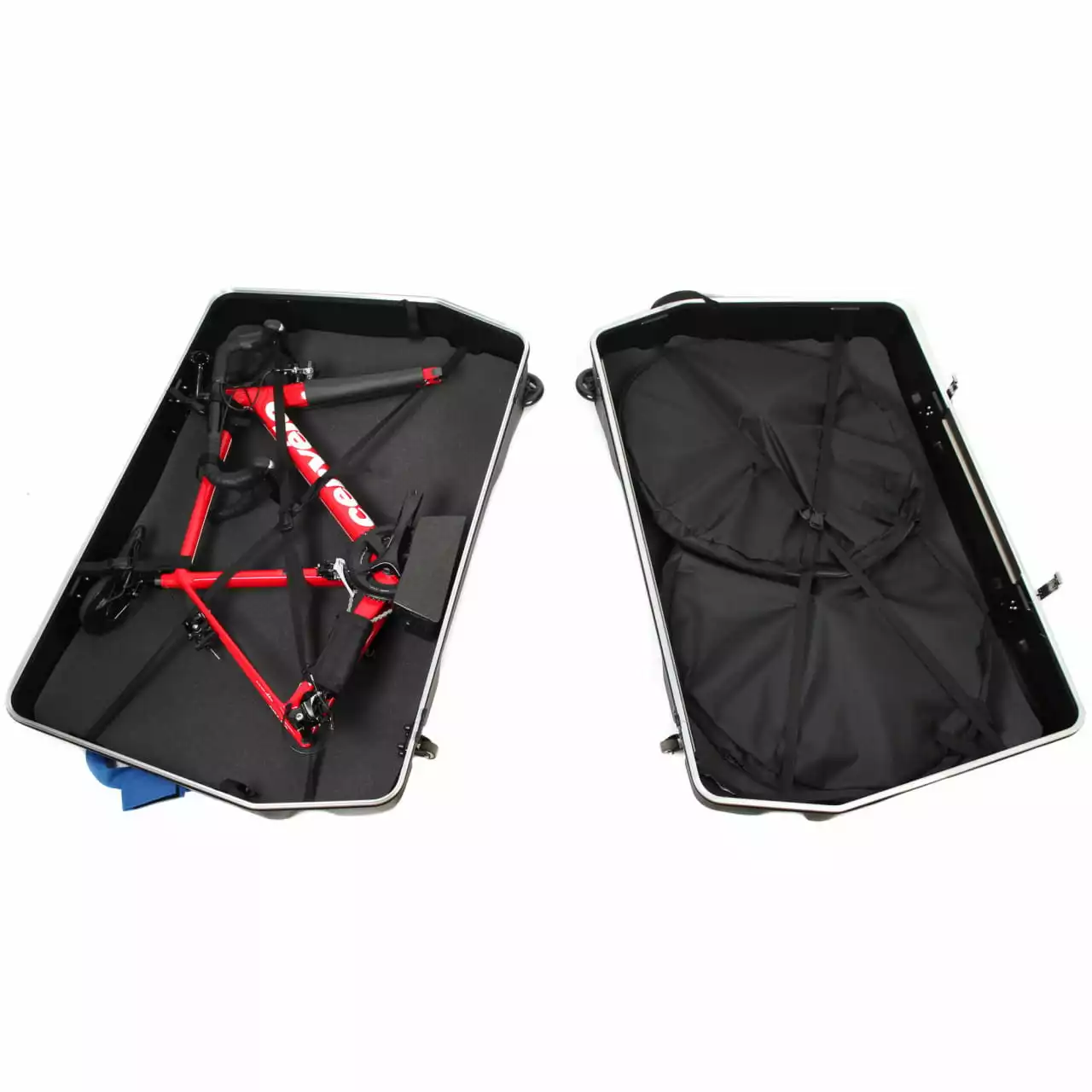 Die beiden Schalenhälften sind voneinander ganz einfach trennbar. Einzeln flach auf den Boden gelegt kannst du nun in Ruhe und mit Bedacht alles verstauen.Dein Bike kommt in die eine Schalenhälfte und deine Laufräder kommen in die zweite Hälfte. Viele kleine Details machen dir das Packen leichter, z. B. der Kettenstrebenschutz, die Abstandshalter für den Lenker und die Taschen für die Laufräder.Der Koffer ist so geräumig, das auch Triathlonräder mit dem Aerolenker eingepackt werden können. Auch 29 Zoll MTBs finden Platz. Und dann bleibt immer noch Platz für deine Radschuhe, Kleidung und Werkzeug. Das spart Gewicht und Platz in deinem normalen Gepäck!