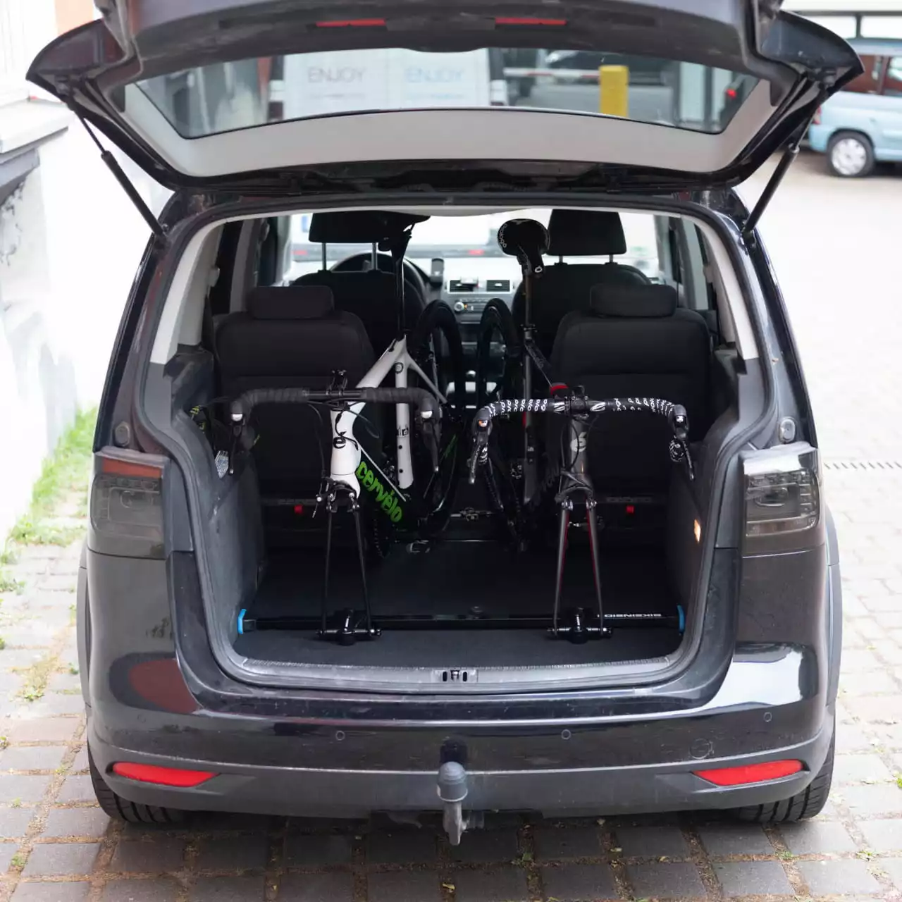 Mit diesem Set lassen sich die heiß geliebten Fahrräder sicher und unkompliziert im Auto transportieren. Auf diese Weise sind die Fahrräder vor Diebstahl, Vandalismus, Schmutz und Nässe geschützt. Außerdem wird die Dynamik des Autos nicht verändert, sodass die Fahreigenschaften und der Kraftstoffverbrauch gleich bleiben. Ein weiterer Vorteil des Transportierens im Auto zeigt sich in Tiefgaragen: hier kann ein Heckträger zum Überschreiten der maximalen Deckenhöhe führen. Mit dem Innenraum-Fahrradträger passiert das nicht.