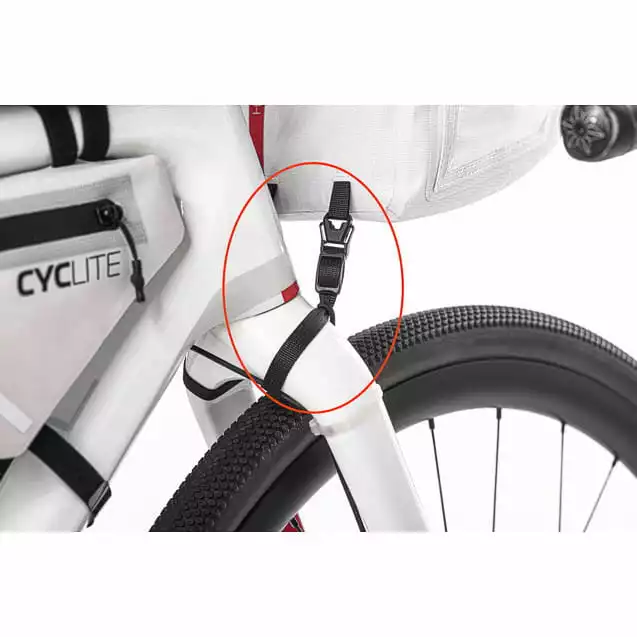 Mit diesem Fixiergurt verleihst du deiner Cyclite Lenkertasche noch mehr Halt, indem du sie zusätzlich an der Lenkergabel befestigst. Dazu musst du den Gurt nur um die Gabel ziehen und anschließend an der Schlaufe der Tasche montieren.