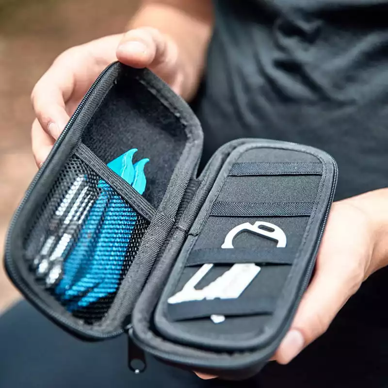 Die käfiglose TWIST toolbox bietet Platz für alle Werkzeuge und Essentials, die für die Tour nötig sind: Reifenheber, Schlauch, Minitool, Flickzeug, Pumpe oder CO2-Kartusche. Dank dem eckigen Design kann aber auch das Smartphone oder der Energieriegel verstaut werden. Die inneren Organisationsfächer- und Taschen halten alles an Ort und Stelle und bieten leichten Zugang.