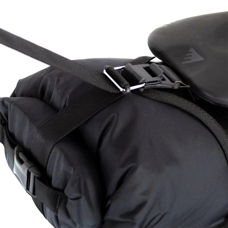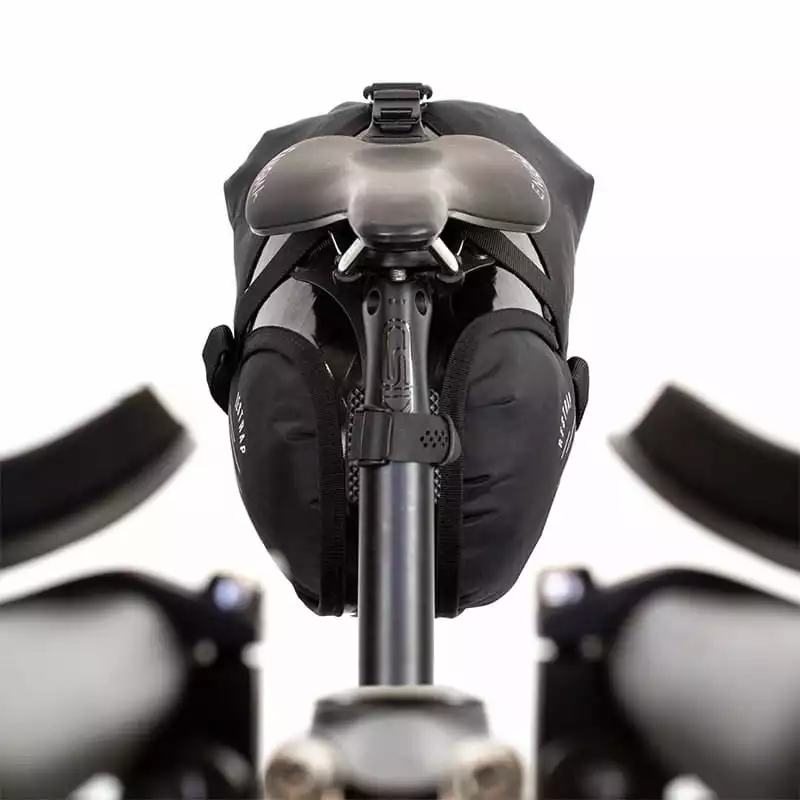 Die neue Restrap Race Saddle Bag besteht aus zwei Teilen. Zum einen ein Holster, welches die Tasche in Form hält und am Fahrrad befestigt wird. Zum Anderen aus dem Dry Bag, welcher im Holster eingespannt wird und Platz für dein Equipment bietet. Der Dry Bag verfügt über 7 Liter Volumen und wird mit einer Fidlock-Magnetschnalle im Holster befestigt. Zusätzlich sind die Logos an der Seite des Dry Bags reflektierend und sorgen für verbesserte Sichtbarkeit bei Nachtfahrten. Der Holster wird über Hypalon-Gurte an der Sattelstütze und den Sattelstreben befestigt.